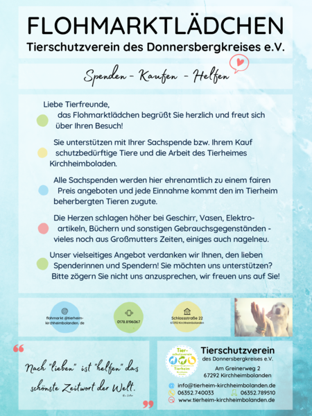 Für Angebote und Ideen bitte Mail an Heidemarie.Domke@tierheim-kirchheimbolanden.de oder Tel: 0178 8196067